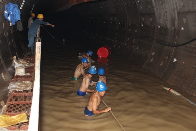7月7日災(zāi)情發(fā)生后,玉龍路地鐵東段頭井基坑積水?dāng)?shù)米深,項(xiàng)目部立即投入排水搶修工作,集團(tuán)公司董事長胡紅勝親自帶隊(duì)搶險(xiǎn),抽調(diào)十余臺(tái)大型抽水泵、25噸泵車到施工現(xiàn)場(chǎng),項(xiàng)目經(jīng)理及現(xiàn)場(chǎng)管理人員一人負(fù)責(zé)一臺(tái)抽水泵的拼裝,綁鐵絲、擰螺絲,自己動(dòng)手,公司總經(jīng)理王智高、支部書記王繁親自安排抽水泵下井工作,經(jīng)過三十多個(gè)工人三天的艱難搶險(xiǎn),終于將隧道中積水排出,一個(gè)星期后成功搶救出被淹沒的盾構(gòu)機(jī)。之后盾構(gòu)維修人員不畏艱難,跟泥土和水災(zāi)作戰(zhàn),將一個(gè)個(gè)零件拆下來進(jìn)行清洗檢修,公司還從海瑞克公司專門聘請(qǐng)兩名專職技術(shù)人員現(xiàn)場(chǎng)指導(dǎo)維修,電氣系統(tǒng)更換配件,重新調(diào)試,液壓系統(tǒng)也送到專業(yè)維修機(jī)構(gòu)進(jìn)行清洗維修,一個(gè)多月里解決了一個(gè)又一個(gè)難題,終于將盾構(gòu)機(jī)修好,具備再次始發(fā)的條件。