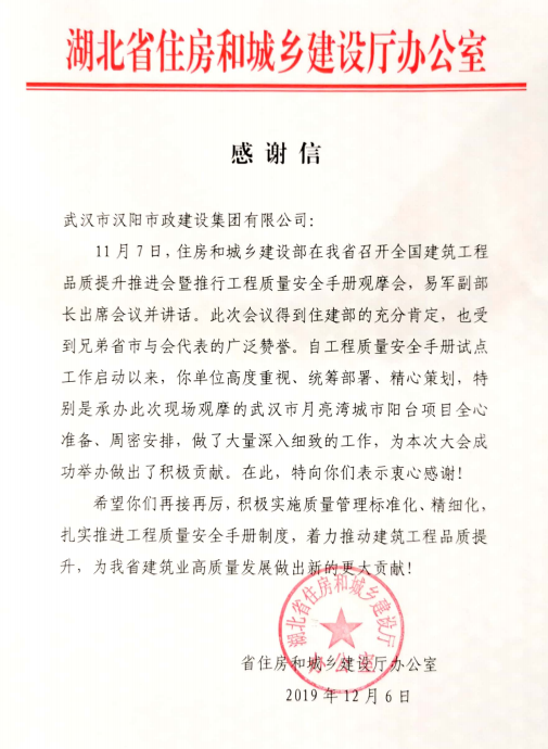 省住建廳在信中這樣說(shuō)到“自工程質(zhì)量安全手冊(cè)試點(diǎn)工作啟動(dòng)以來(lái),你單位高度重視、統(tǒng)籌部署、精心策劃,特別是承辦此次現(xiàn)場(chǎng)觀摩的武漢市月亮灣城市陽(yáng)臺(tái)項(xiàng)目全心準(zhǔn)備、周密安排,做了大量深入細(xì)致的工作,為本次大會(huì)成功舉辦做出了積極貢獻(xiàn),在此特想你們表示衷心感謝?!?/span>