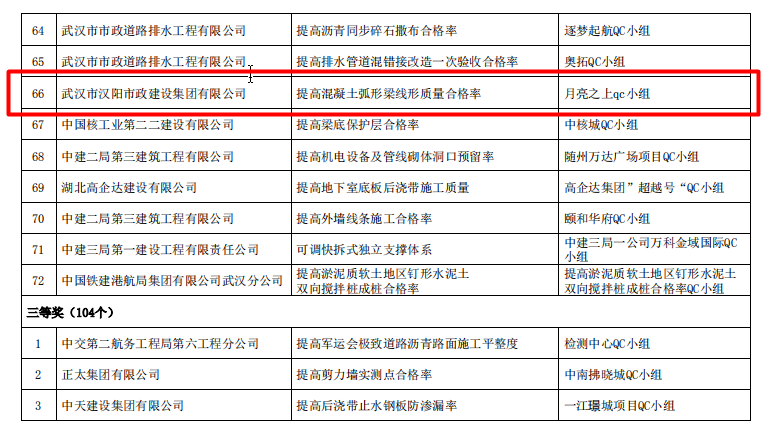 近日,武漢建筑業(yè)協(xié)會舉辦的QC成果交流會捷報頻傳,經過激烈角逐,鐘鑫公司參評的3項QC成果在77家企業(yè)申報的365項QC成果中突出重圍,大放異彩。其中,《擋土墻反濾構造裝配式創(chuàng)新型施工》成果榮獲一等獎,《提高混凝土弧形梁線形質量合格率》成果榮獲二等獎,《控制臨江地鐵隔離樁施工隧道沉降預警研究》成果榮獲優(yōu)秀獎,鐘鑫公司QC成果再獲重大突破!